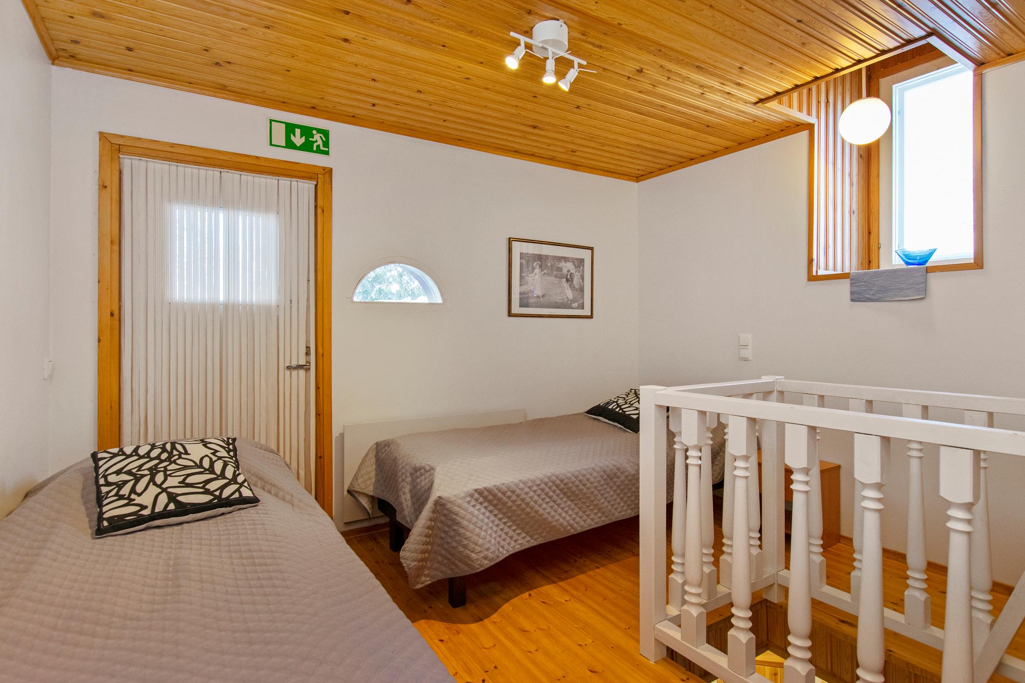 A semi-detached house located in the Ukkohalla tourism centre, 37 m² + loft 8 m², built in 1989. Kitchen, bedroom, loft, sauna, shower room/toilet, balcony, terrace, fireplace and firewood. A double bed in the bedroom (120 cm), 2 x 80 cm bed on the loft and a sofa-bed in the kitchen.