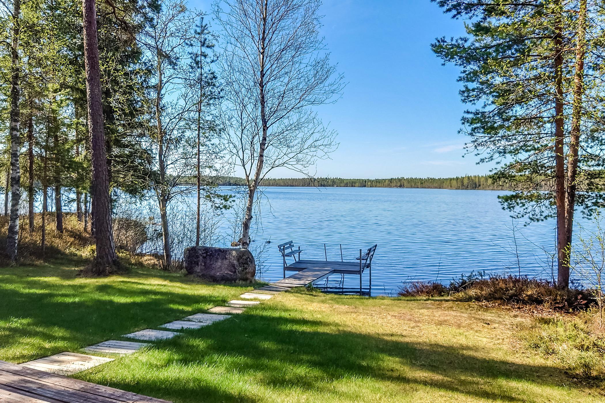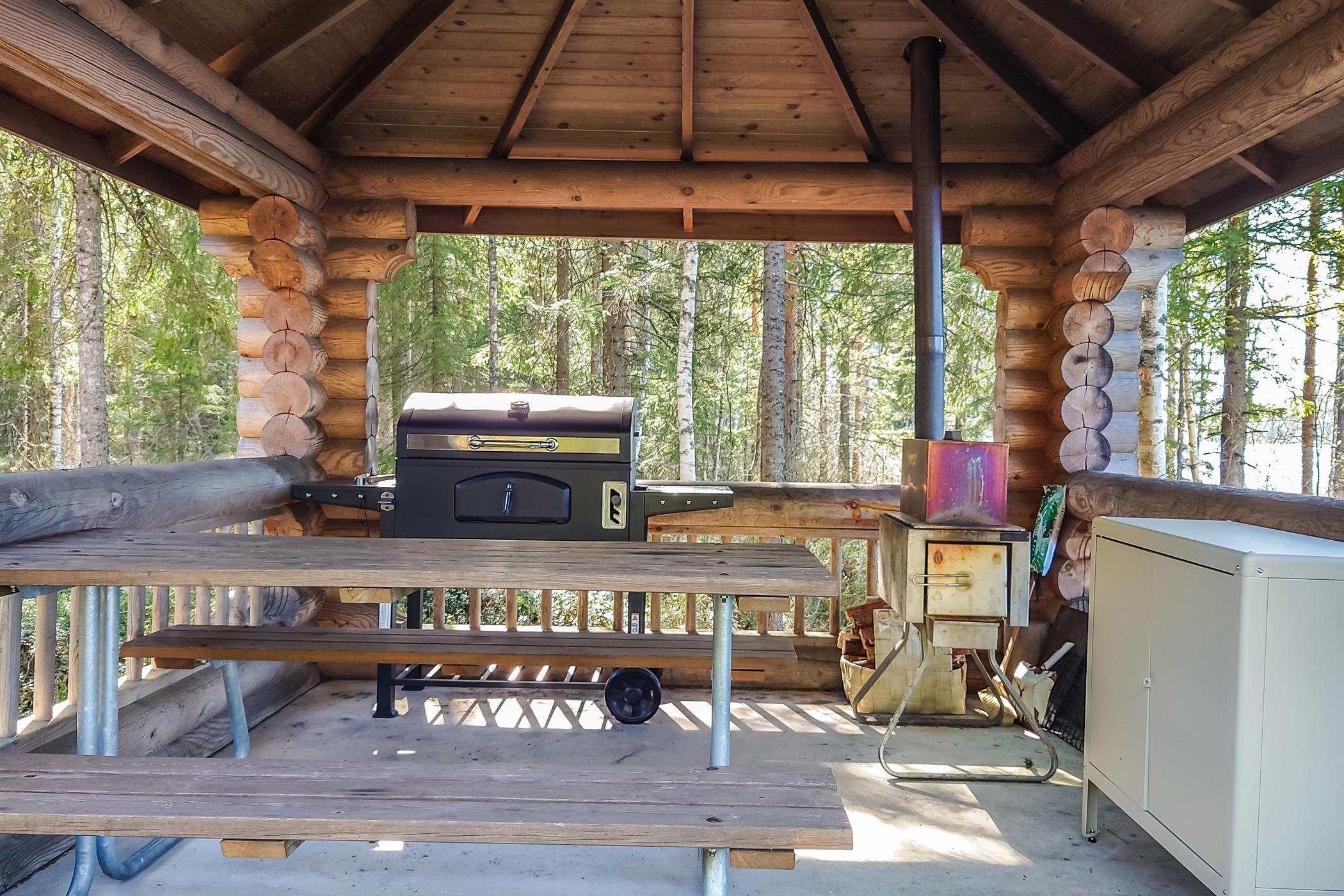 Cottage has heating pump/inverter air conditioning system. Between cottage and lake a grassed area. Barbeque shelter (with charcoal grill) on the shore.