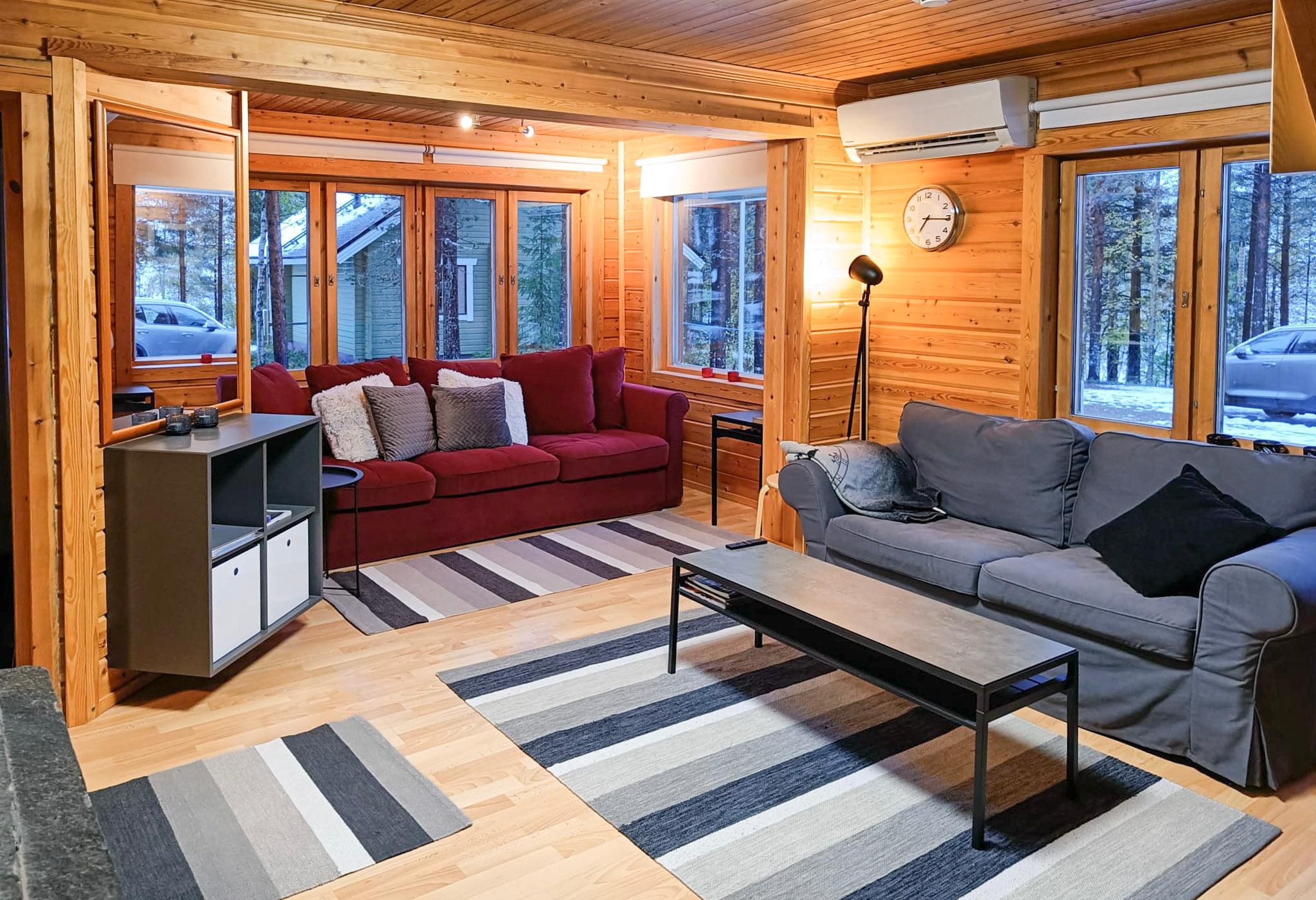 Mökin alakerrassa on mukavat oleskelutilat sekä yhdistetty keittiö ja ruokailutila.