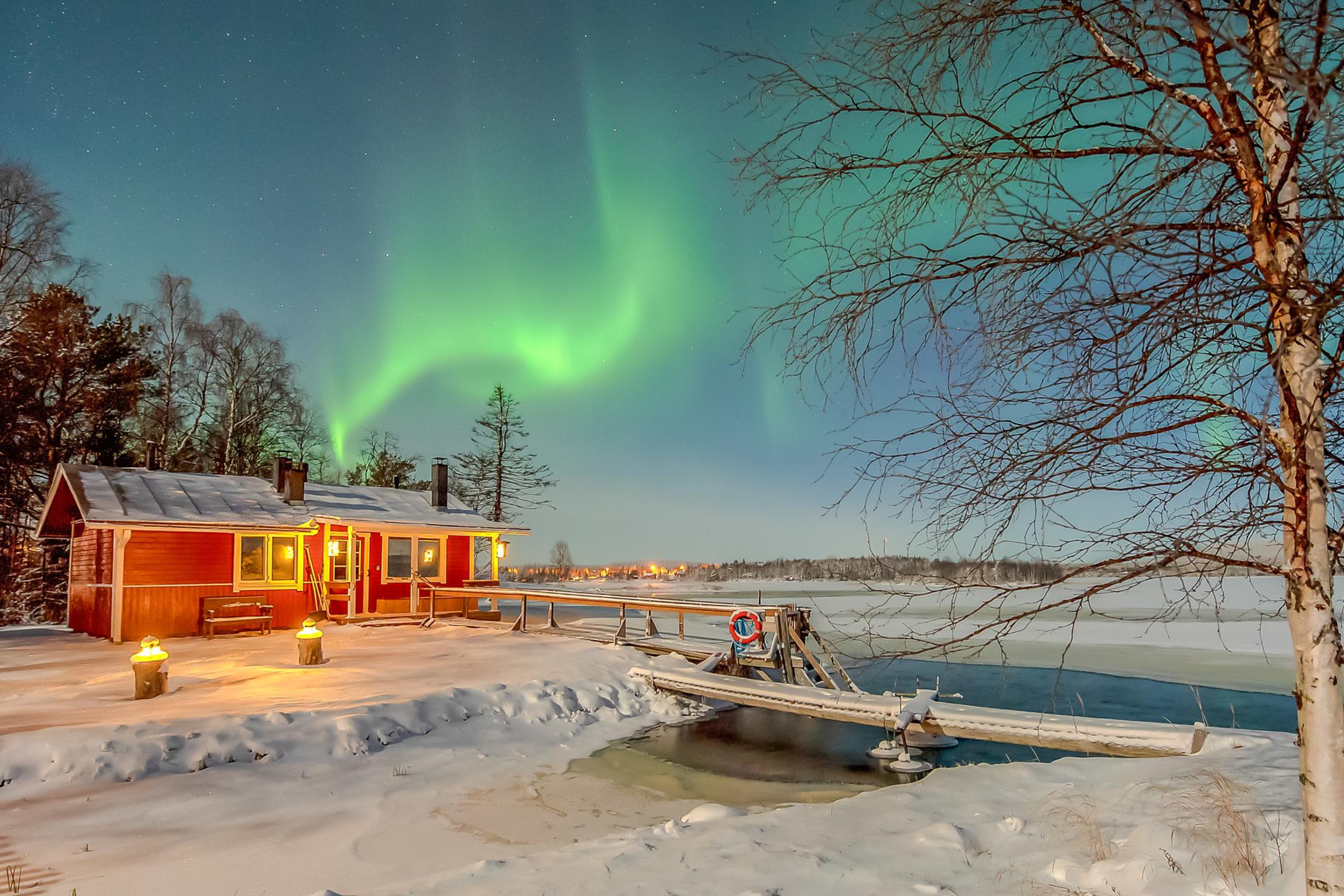 Revontulimökki; Mökissä olevaan puhelimeen tulee viesti jos isäntäväki näkee revontulia ja ne voi itsekin bongata makuuhuoneen ikkunasta. Vieressä oleva Äkäslompolojärvi on maankuulu paikka revontulten katseluun! Kaikki palvelut kävelymatkan päässä, silti rauhallinen pihapiiri.