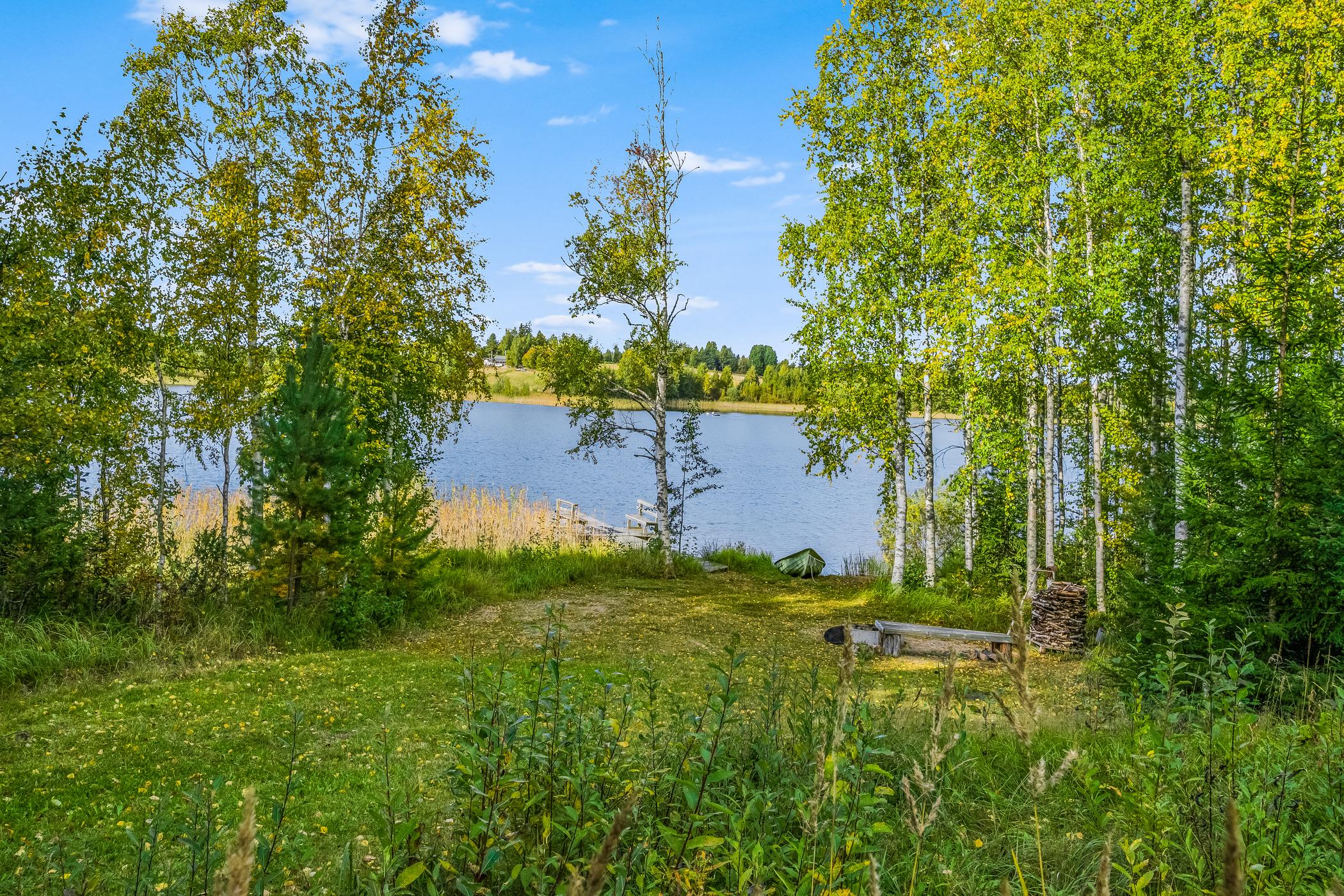 Perinteinen mökki aurinkoisella tontilla. Mökiltä loiva rinne rantaan. Rannassa tulipaikka.