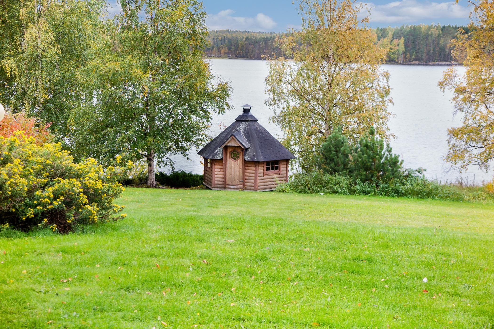Avara hirsihuvila yhdessä tasossa. Korkeatasoinen varustetaso. Tasainen, nurmikkoinen ja valoisa pihamaa, loivaa rinnettä rantaan.