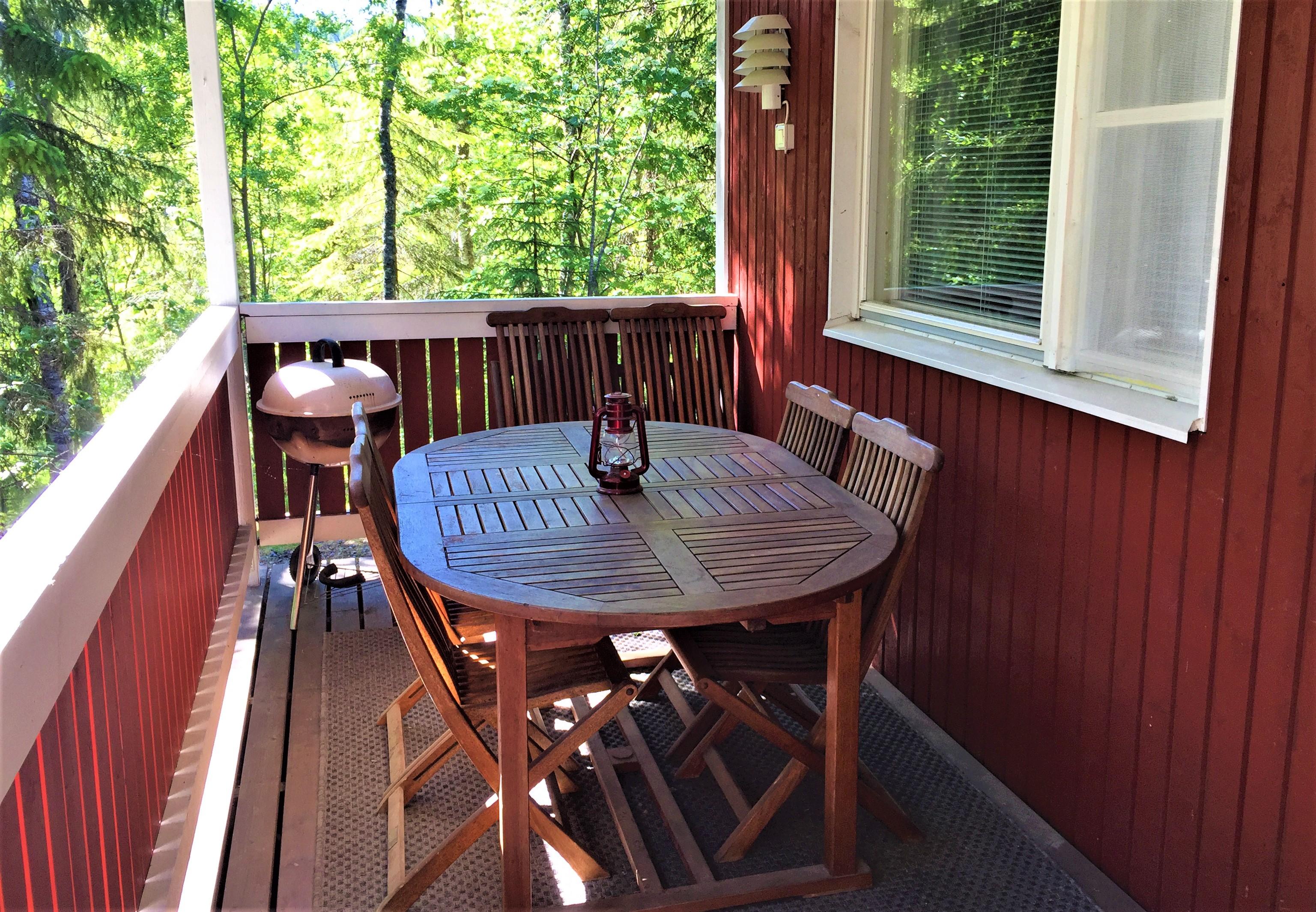 Lapsivarustuksena matkavuode ja syöttötuoli. Hiiligrilli.
